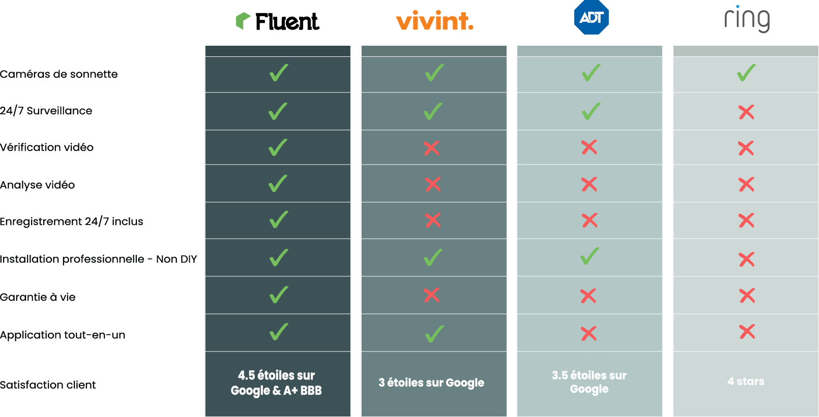 Le choix d’un système de sécurité domestique peut être difficile, mais Fluent Home le rend facile. Non seulement nous offrons des solutions personnalisées qui répondent à vos besoins uniques, mais nous devançons également la concurrence grâce à des prix plus compétitifs. Voyez comment nous nous situons par rapport aux autres :